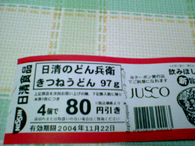 ケータイからメールで更新。どん兵衛の割引券つかって買ったら割引券もらったよ(;^_^A